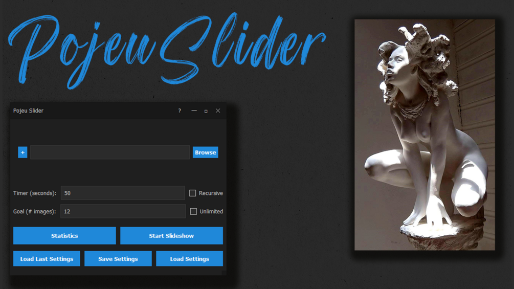 This app is an easy to use, responsive and snappy slideshow viewer, primary thought to be used as a drawing practice tool.